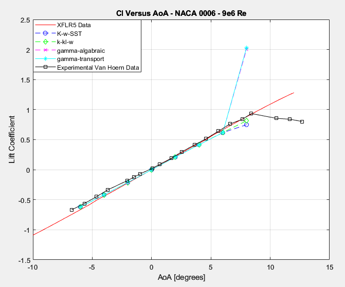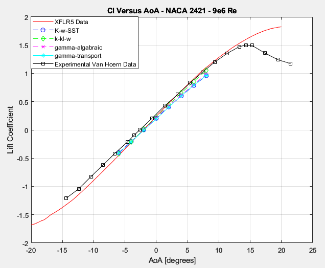 With respect to the thicker NACA 2421 airfoil, the story seems to be similar to that of the NACA 0006 airfoil. Specifically, the lift values are not particularly sensitive to the specific model being employed.