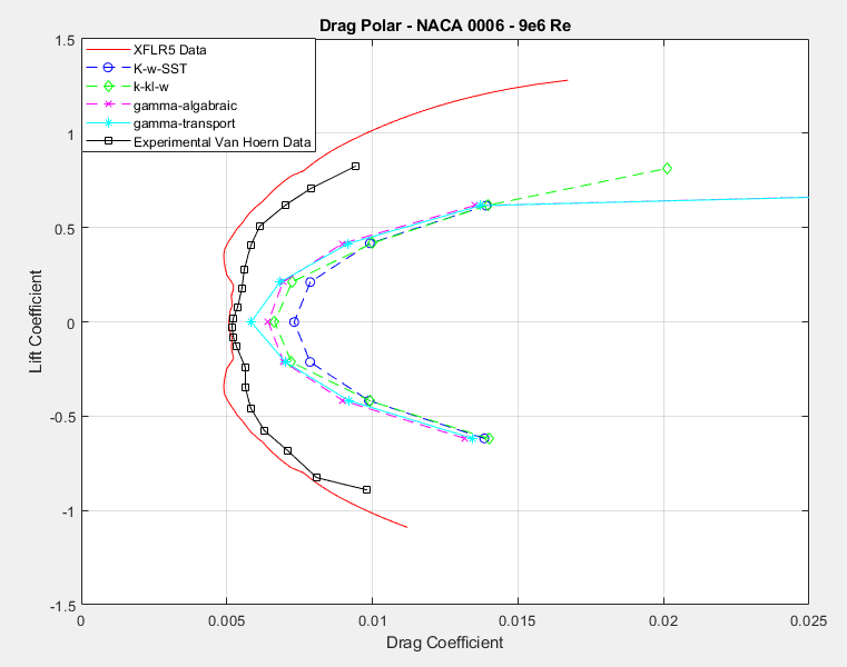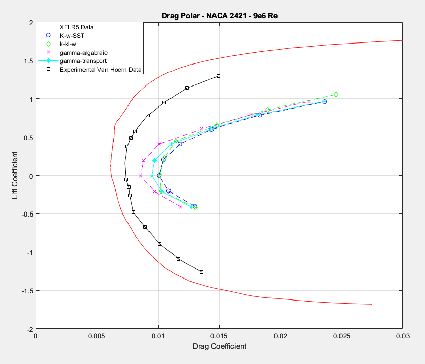 As already discussed in My previous post, ordinary RANS models such as k-w-sst seem to struggle to get reasonable drag values, especially in low to medium reynolds flows, because they are not equipped to properly predict the tranisition point from laminar to turbulent flows, which can signficantly affect the drag forces on a streamlined object such as an airfoil.