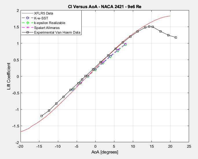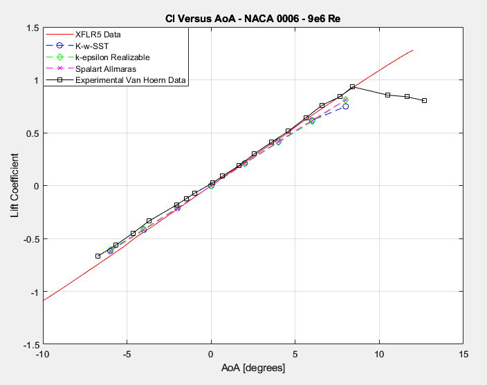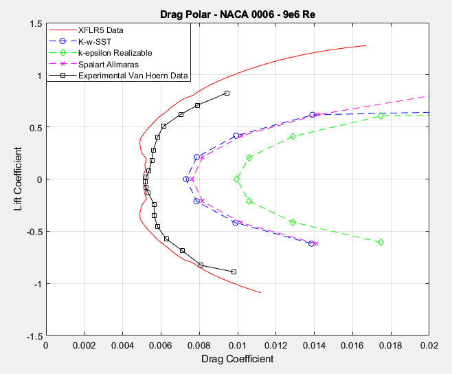 This project aimed to compare the relative accuracy of several different RANS models compared to the viscous/inviscid methods of Xfoil, which was indirectly derived from the XFLR5 program. Several different airfoils with varying levels of thickness, camber, and leading edge radii were chosen so as to better represent the diversity of airfoils out there. It is important to note that this analysis is only focused on the incompressible & subsonic regimes, which tends to favor viscous/inviscid methods due to their alleged increased robustness in predicting transition and such, at least this is what the author currently understands the situation to be. The results will be compared to experimental data cited in the book “Theory of Wing Sections” by Albert E. Von Doenhoff and Ira Abbott. The author used the “web plot digitizer” program to get actual values from the graphs in the aforementioned book to the best of his abilities.