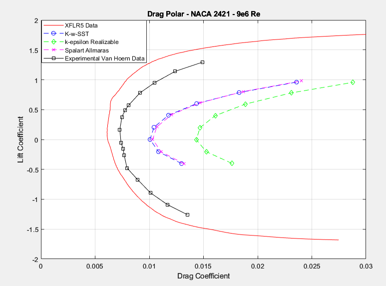 Moving on to drag predictions, the drag polars in figures 18 & 19, illustrate a massive spread. Disappointingly, despite its much higher cost, RANS methods seem to massively over predict drag. Unsurprisingly, the K-w-sst model seems to be the best RANS performer, being closely followed by Spalart Allmaras. However, the author didn’t expect the large difference between the two aforementioned models and k-epsilon. It is somewhat amazing how close the Xfoil viscid/inviscid methodology got in terms of predicted drag values. I would imagine that this trend only holds for incompressible and subsonic flows and that RANS becomes much more accurate when mach numbers are above perhaps 0.3. It is also interesting to note that Xfoil seems to consistently underpredict drag on airfoils, which should be kept in mind during airfoil selection.
